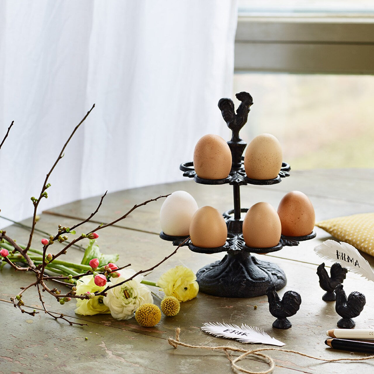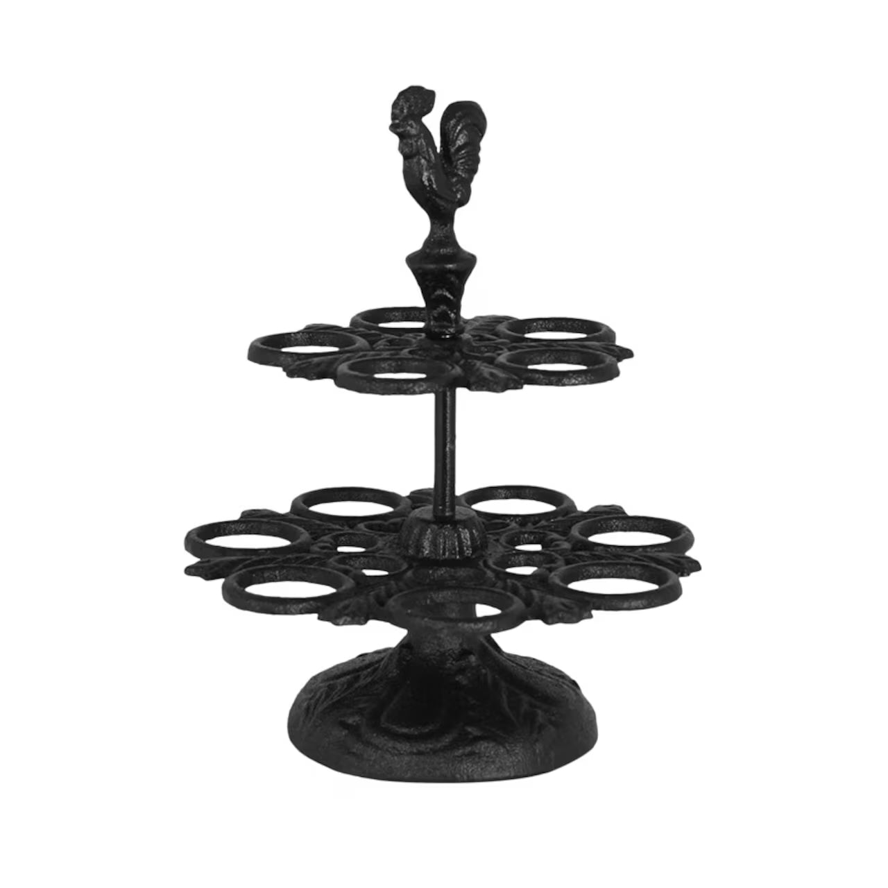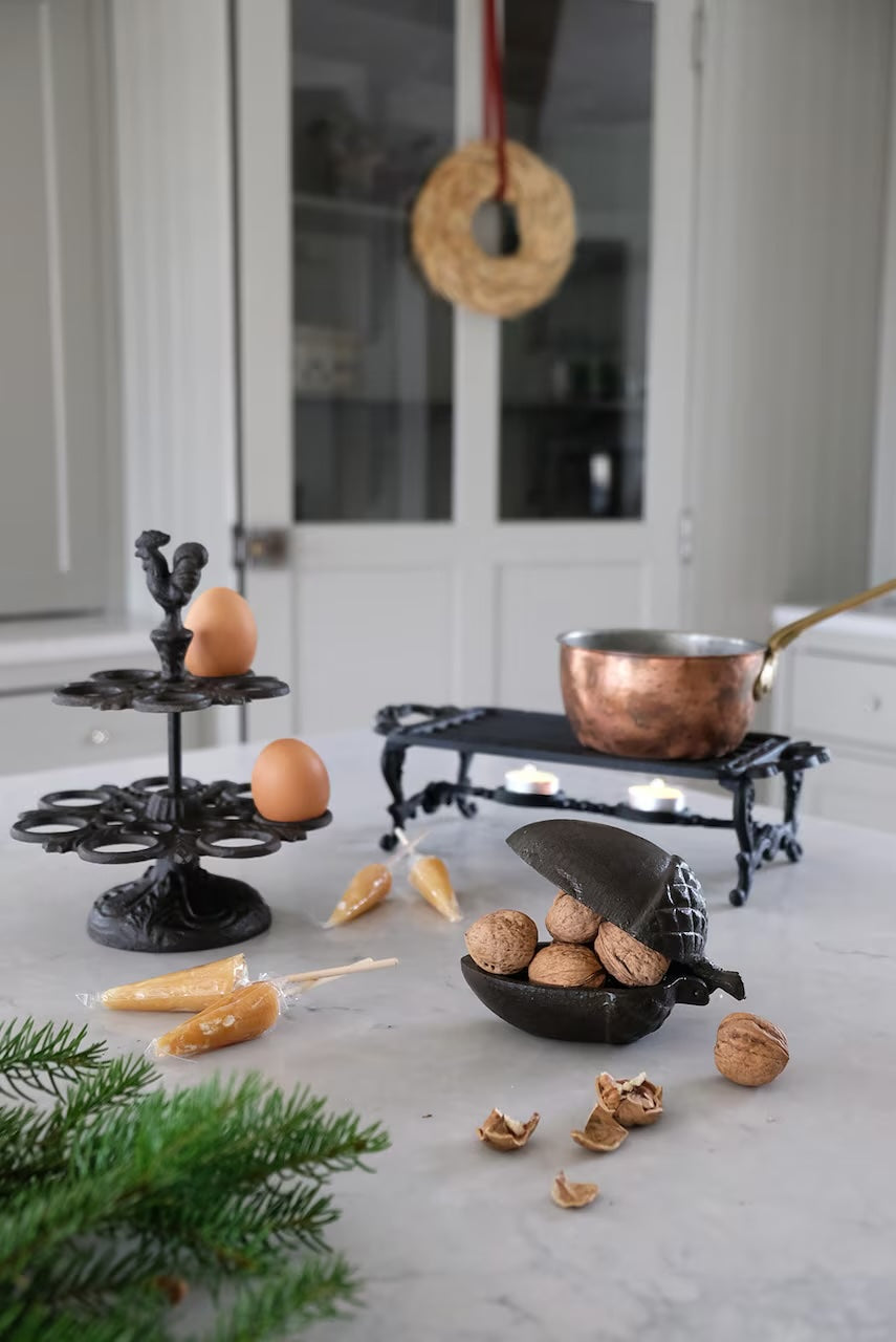 Charmig ägghållare med en tupp i toppen tillverkad i gjutjärn. Ägg kan utan problem förvaras i rumstemperatur och då blir den här hållaren snygg förvaring på köksbänken. Lantlig detalj som också blir fin på buffébordet.