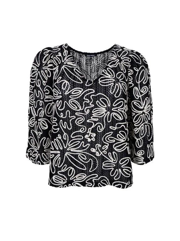 Blus i virkat spetstyg med överdrag kontrasterande konturer blomapplikationer.