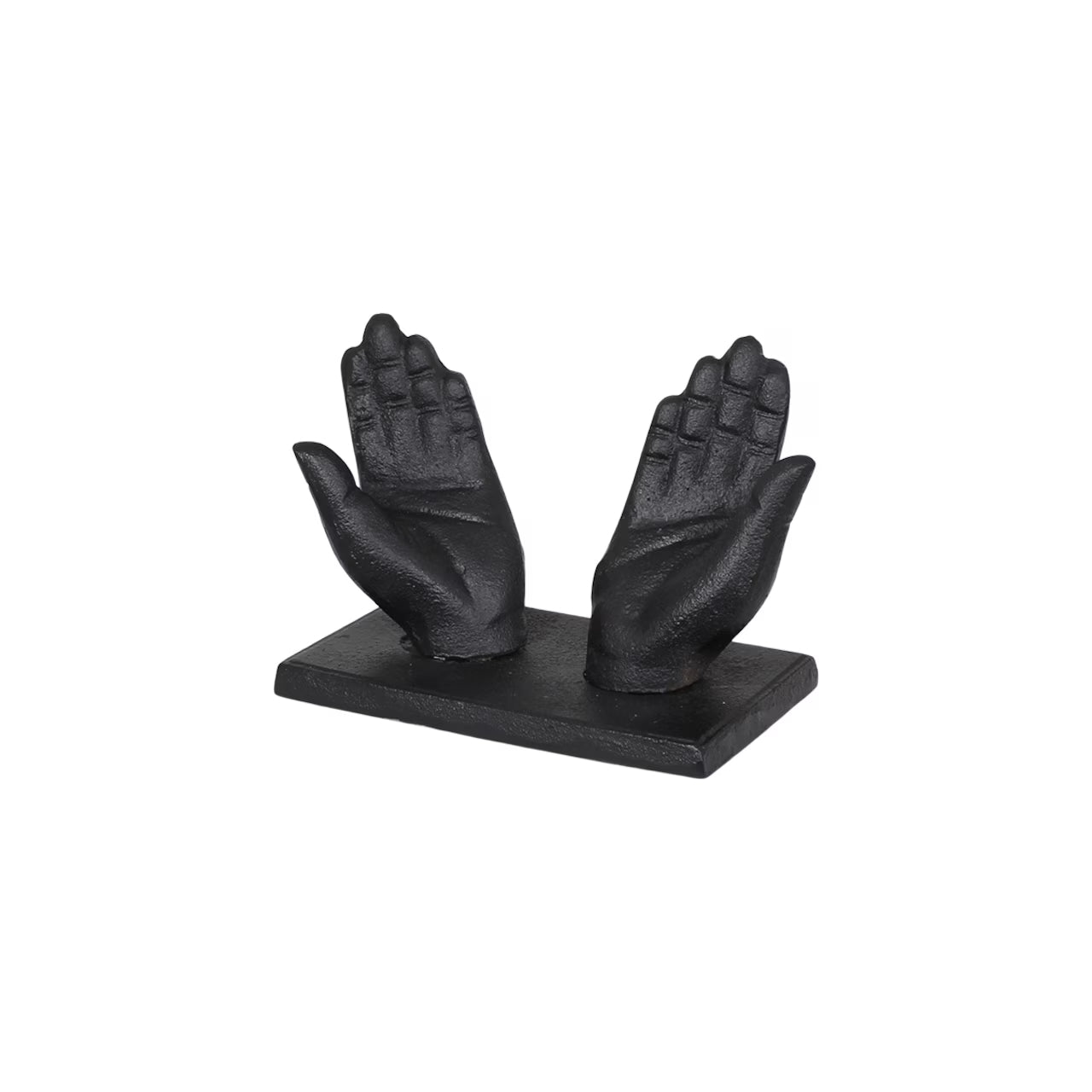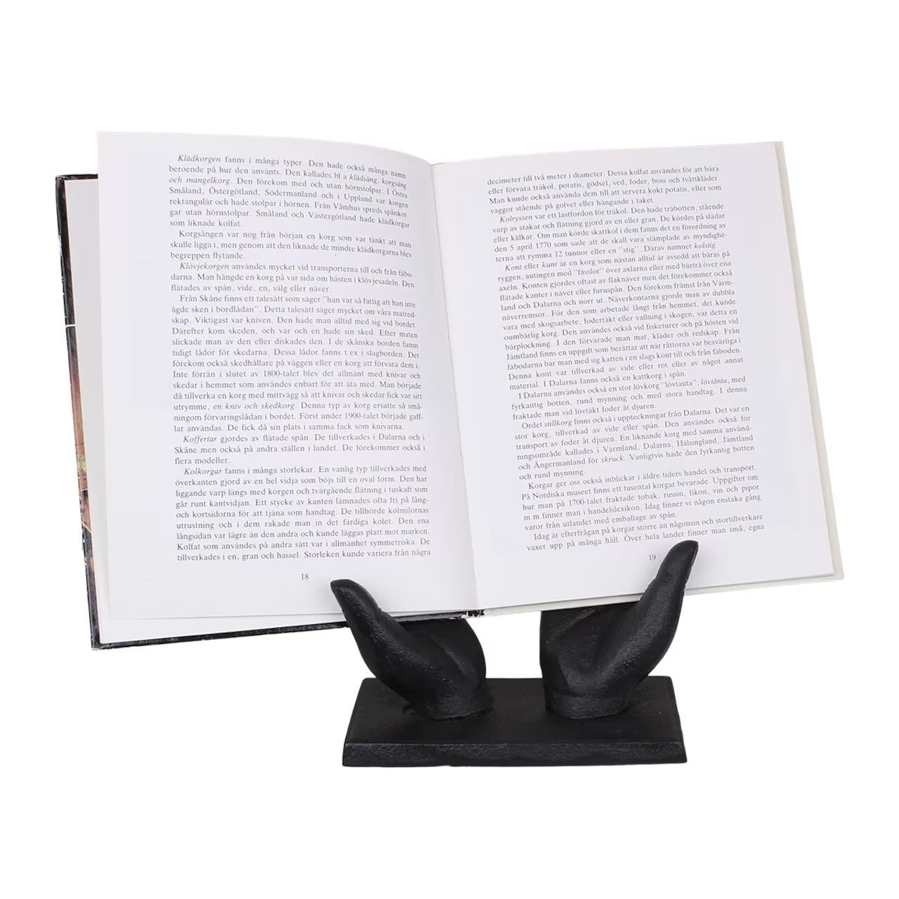 Bokhållare tillverkat i svart gjutjärn i form av två händer. Boken placeras i händerna där du kan visa upp specifika sidor. Bokstödet blir en del av inredningen och uppmuntrar till att stanna upp och läsa. Bokhållaren passar bra som kokboksstöd när du läser recept i köket.
