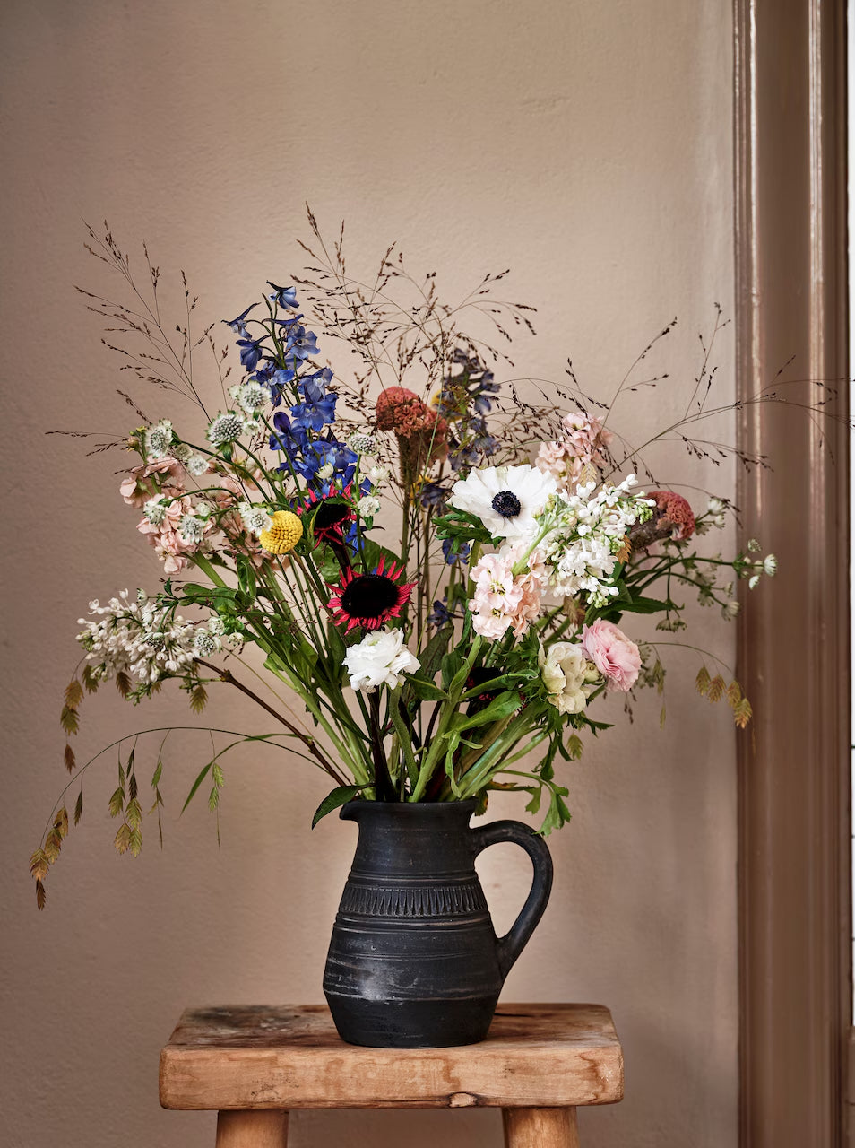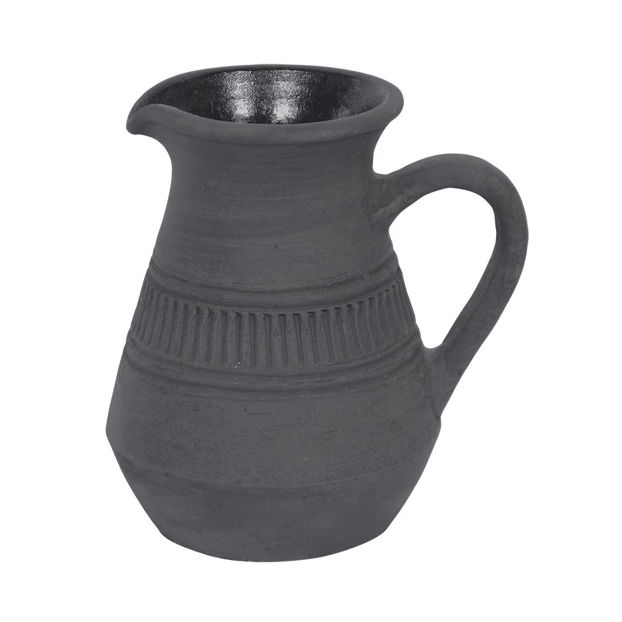 Handdrejad kanna i lergods med karvad dekor. Kannan har glaserad insida som gör att den lämpar sig för diverse dryck eller som vas. Med sitt mönster och klassiska form för Juan oss i tankarna till en taverna i medelhavet. Leran är ett traditionellt och beprövat material som åldras vackert och har naturliga färgskiftningar. Lera är poröst, vilket gör den känslig för väta och inte är garanterad 100% vattentät. Produkten är giftfri.