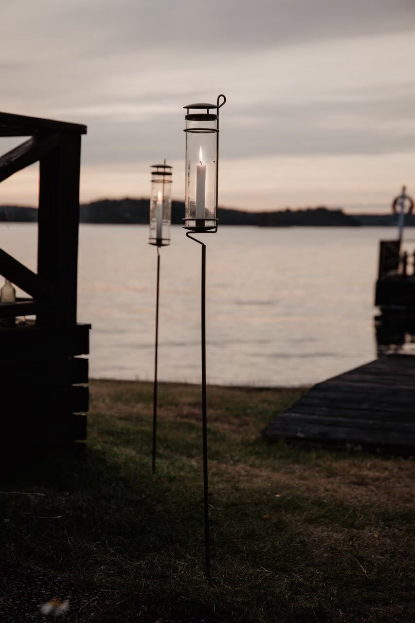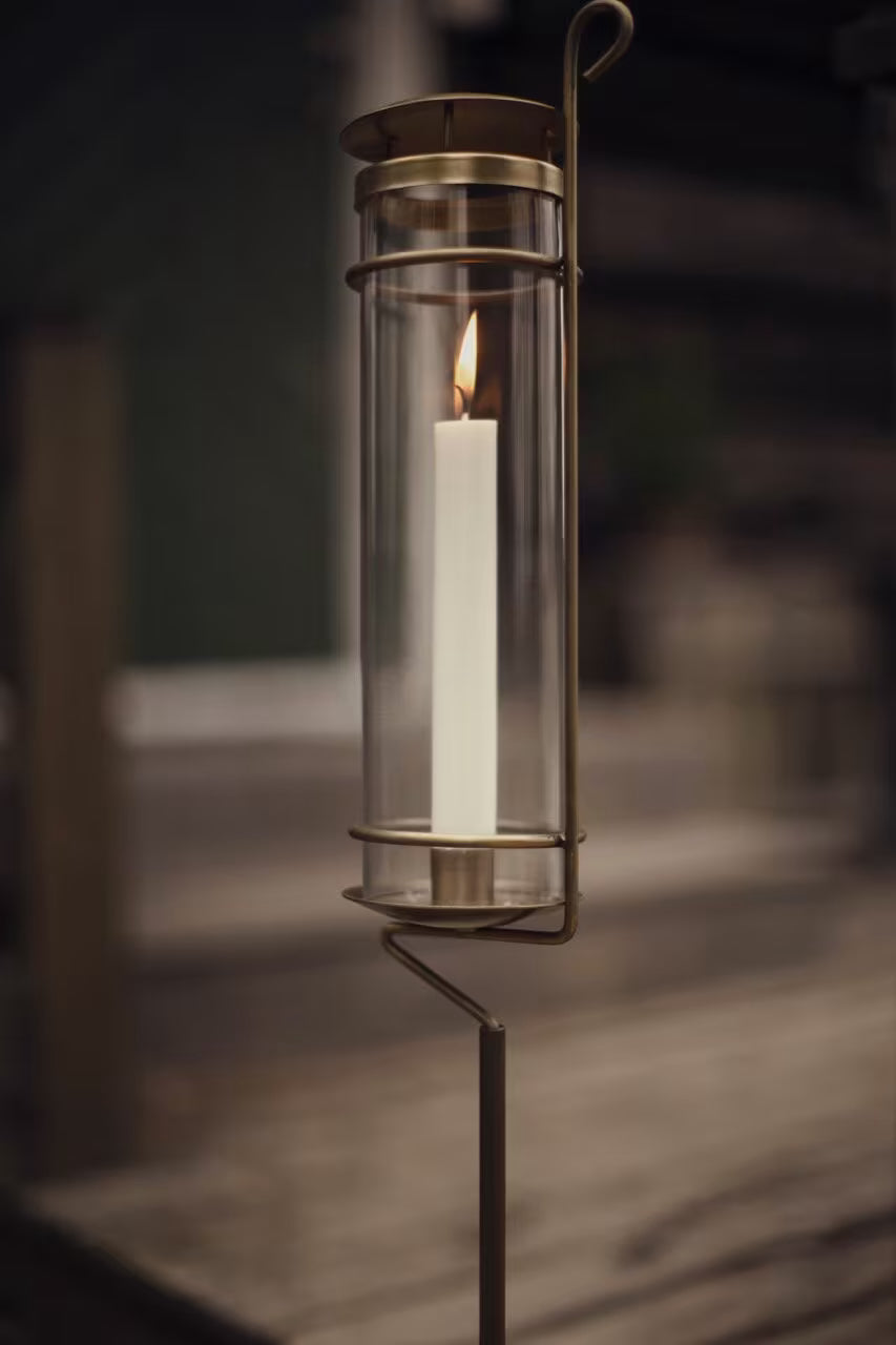 Ljuslykta i glas och mässingsfärgad metall med antik finish. Lyktan sticks ner i marken eller i en kruka och blir en fin detalj i trädgården, på uteplatsen eller balkongen. Passar till vanliga stearinljus/kronljus.