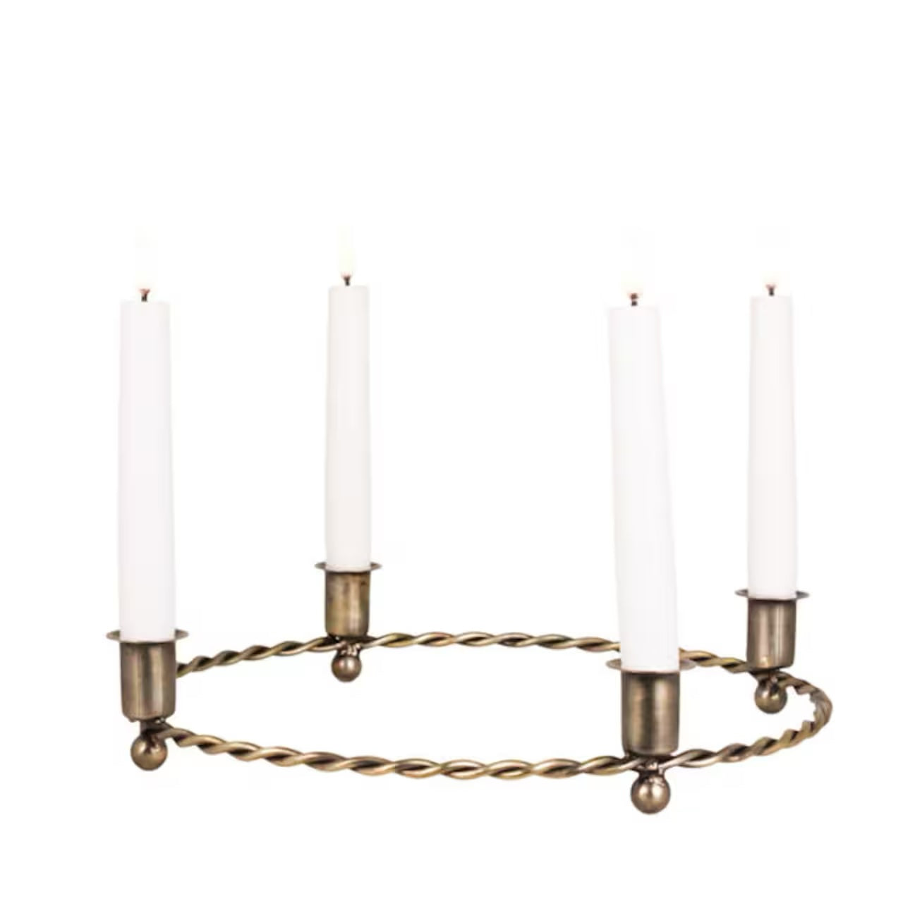Rund ljusstake i antik mässing, med hållare för fyra kronljus. Den vackra patinan och de åldrade detaljerna gör att den passar fint in i lantliga, klassiska och rustika hem. Placera ljusstaken på ett sidobord, en byrå eller mitt på middagsbordet för att skapa en förtrollande atmosfär under kvällens middagar eller speciella tillfällen.