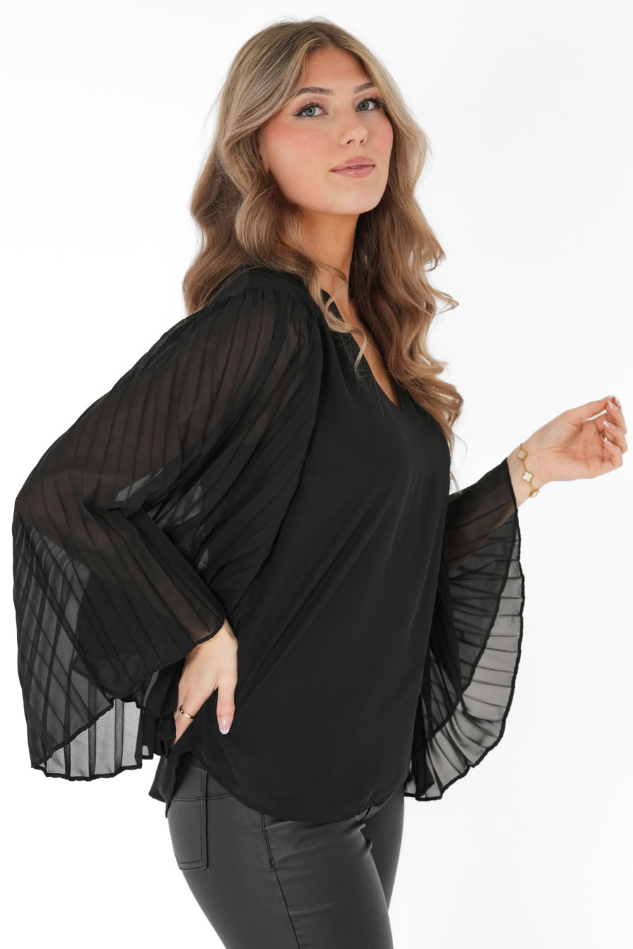 Marcella Blus är en stilren blus med vackert v-formad urringning. Plisserade och väldigt vida hellängdsärmar. Blusen har rundade nedkanter och är lite längre baktill. Yttertyget är gjord i en skir polyester chiffon med ett fastsytt viskosfoder i trikå. Matcha med ett par jeans eller en snygg kjol och du är redo för alla typer av tillställningar!