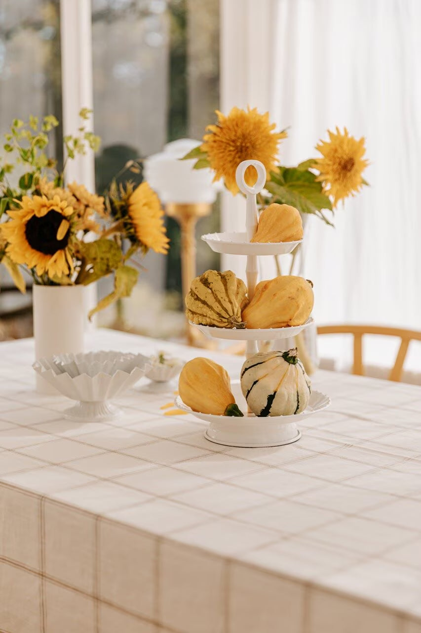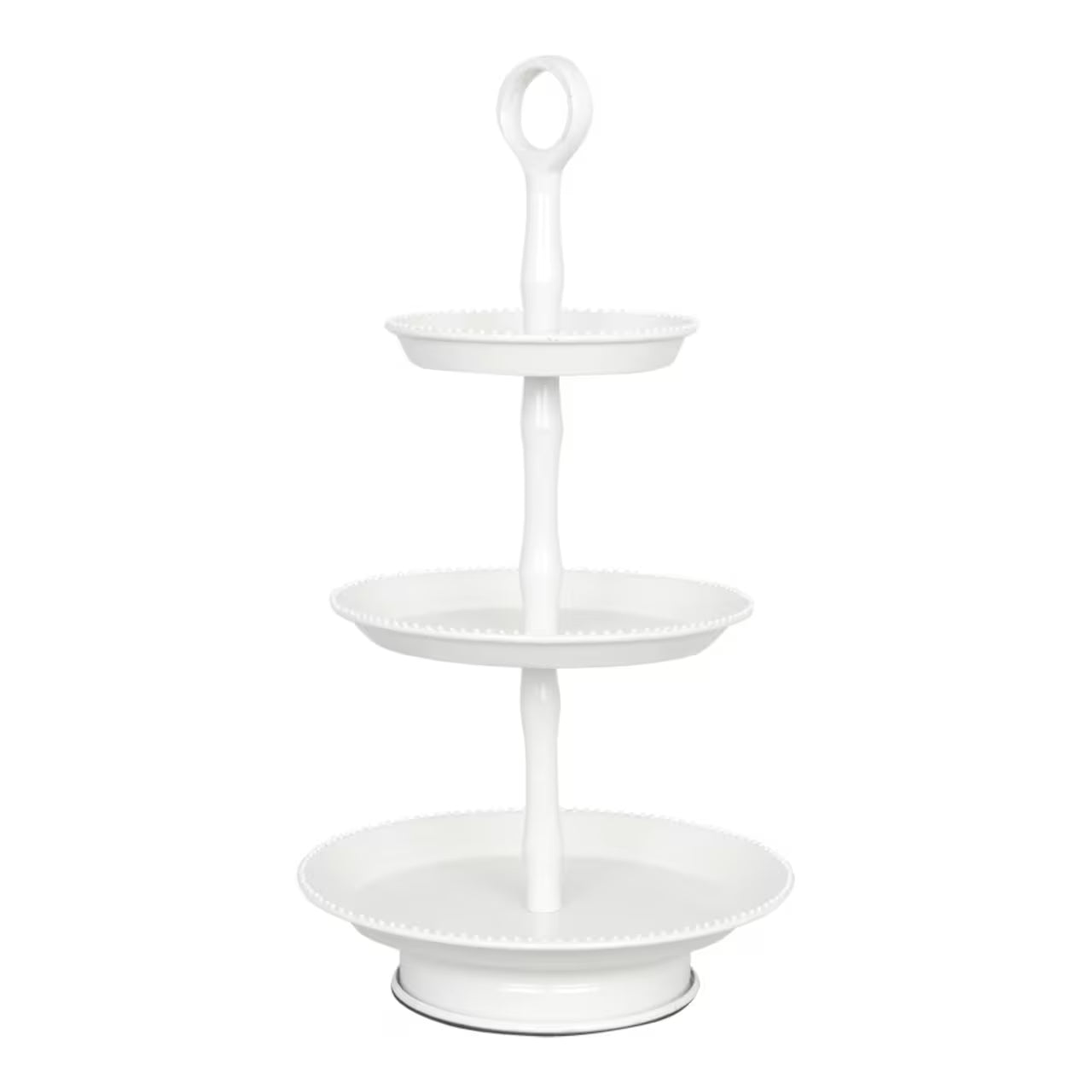 Vitt kakfat i tre våningar med dekorativa prickiga kanter. Perfekt som tårtfat eller servering till buffén. Handtag högst upp för lätt förflyttning.