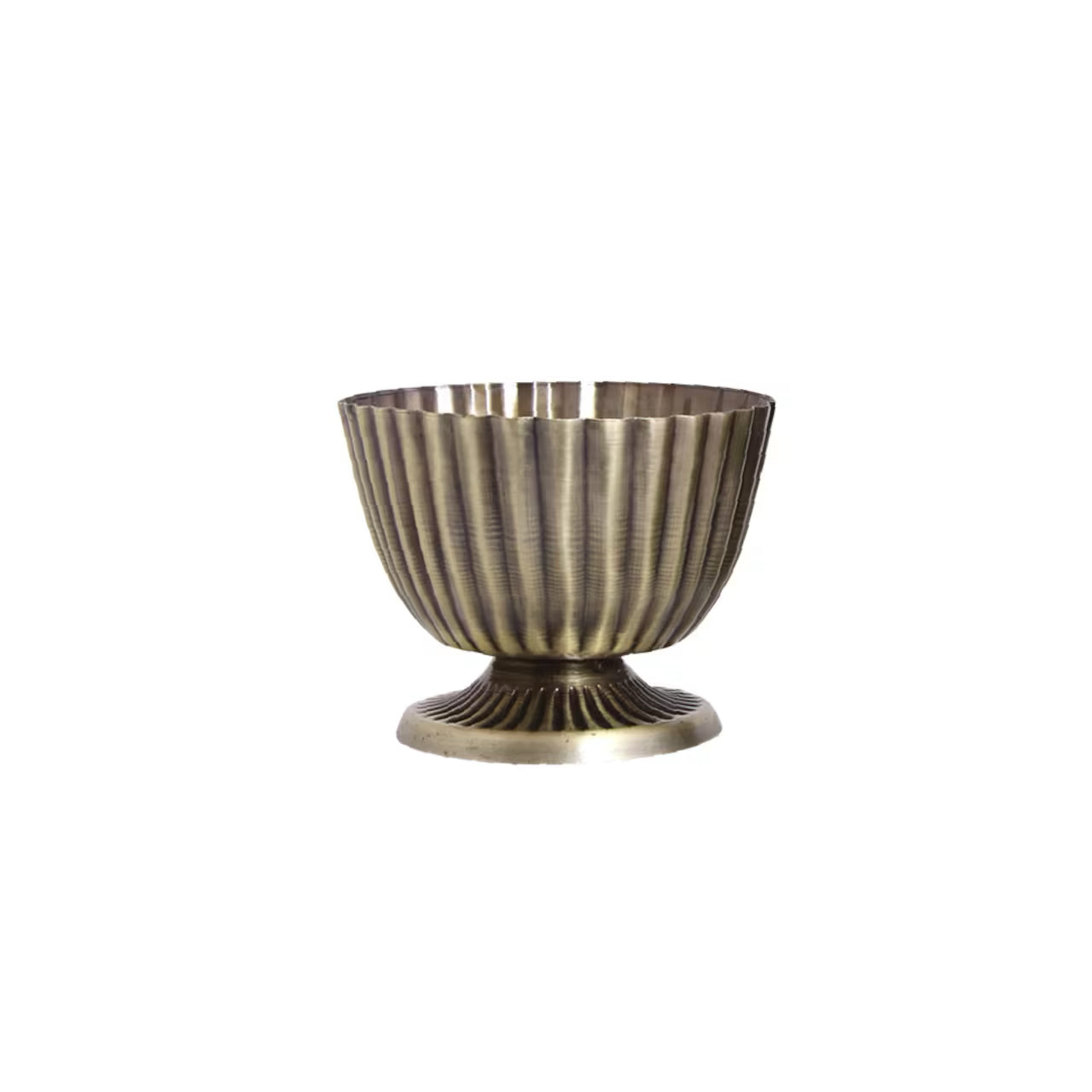 Liten dekorativ kruka på fot i plåt med en antik mässingsfinish. Fin även som vas. Finns i två storlekar.