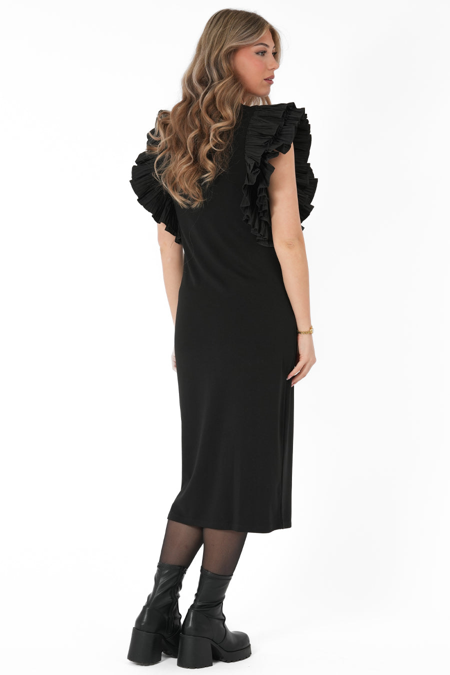 Figurnära klänning gjord i mjuk trikåkvalité med dubbla volang i vävt material runt ärmöppningen.